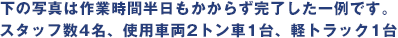 気が付けばいつの間にかゴミの山… 自分ではどうにも出来ない、どこから手を付ければいいのかわからない、そんなゴミ屋敷の片付け、処分、撤去後のルームクリーニングや畳の表替、フローリングの補修、壁紙の張替、庭木の剪定など幅広く対応。 専門スタッフがスピーディーに作業いたしますので他社に比べ短期間でお部屋をスッキリ元通り、きれいにすることができます。 1ルームタイプなら1時間~半日、2DK、3DKタイプなら半日~2日、4部屋以上の戸建タイプなら1~4日程度で片付け可能です! (搬出状況、ごみの量により多少前後する場合がございます)